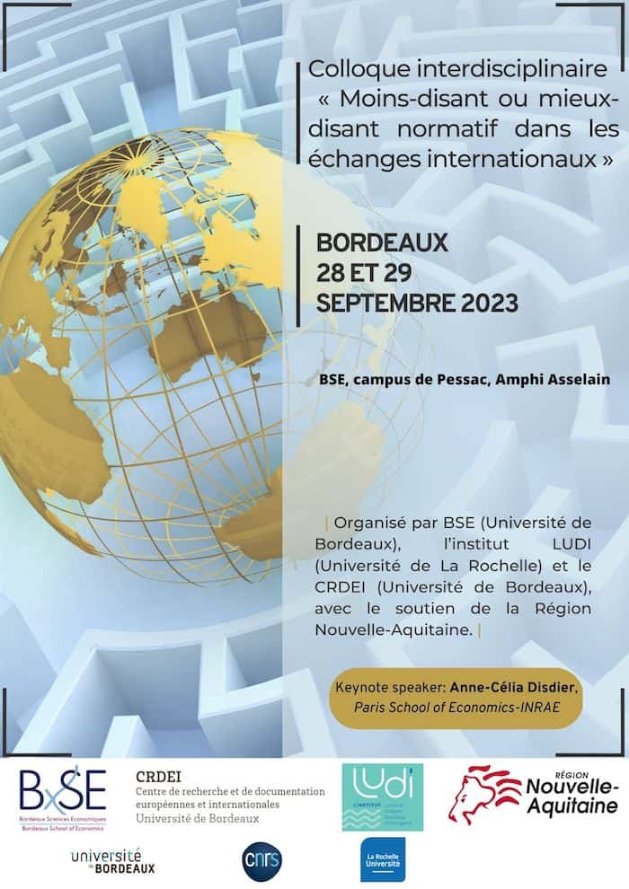 Le colloque organisé dans le cadre du contrat Région « Moins-disant ou mieux-disant normatif dans les échanges internationaux » vise à confronter les regards croisés des économistes, des juristes et des gestionnaires sur la question cruciale des normes dans les échanges internationaux. Les normes sont non seulement au centre des débats sur la libéralisation des échanges de biens et services, mais aussi au cœur de la géo-économie mondiale où les différents modèles normatifs se concurrencent entre eux. Les thématiques du colloque (non exhaustives) sont :