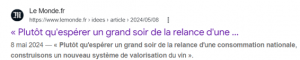 « Plutôt qu’espérer un grand soir de la relance d’une consommation nationale, construisons un nouveau système de valorisation du vin », Le Monde, 8 mai 2024