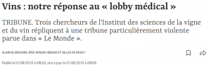 Blanchard, A., Giraud-Héraud, E., de Revel, G. (2018), “Vins : notre réponse au « lobby médical” ; Le Point.fr ; http://www.lepoint.fr/vin/reponse-au-lobby-medical-01-08-2018-2240568_581.php